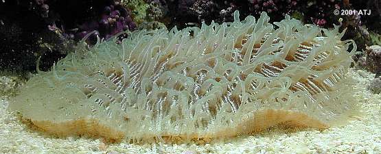 Fungia sp. in aquarium at night with tentacles expanded. |