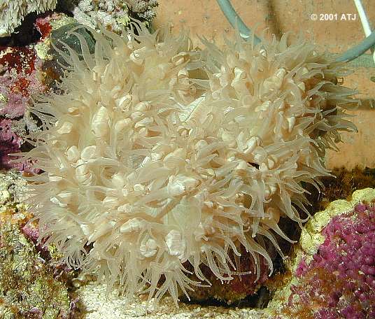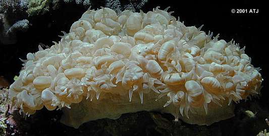 Bubble Coral P. sinuosa in aquarium at night showing feeding tentacles fully expanded. |