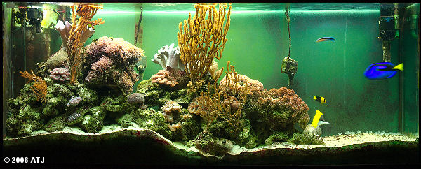 Decorations: 71kg of Live Rock. 12cm of Sand bed (60 kg #00 Marble Chip/115 kg Pool Dust) substrate. |