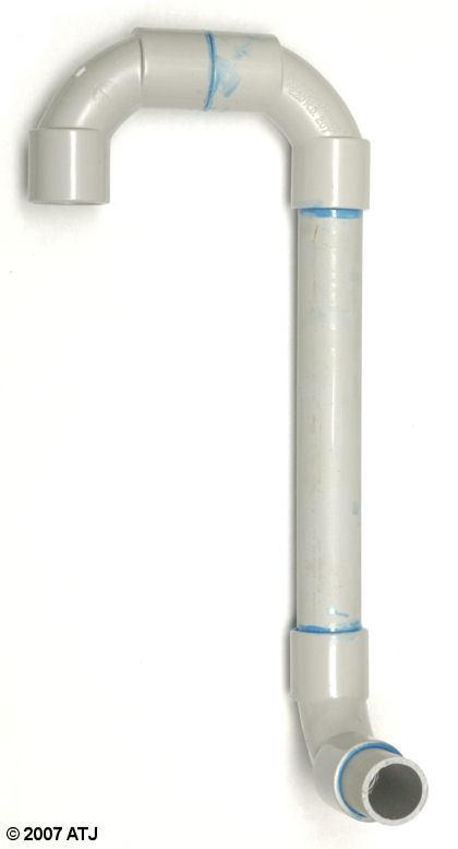 As mentioned above, the outside diameter of the nozzle cone matches that of 20mm electrical conduit. This means 20 mm electrical conduit do construct and inlet extension to plumb the pump to the smaller pump in the tank. Three solid elbows and lengths of conduit are required to plumb the nozzle cone on the skimmer pump to the pump in the tank (See Figure 8). These should be glued to prevent leaks, but construct it without gluing first to ensure all the conduit is at the right lengths.