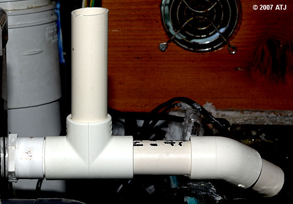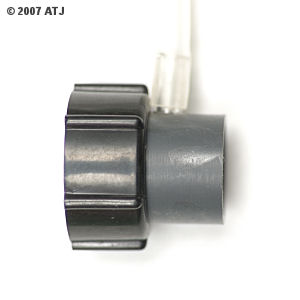 Three or four millimetres have to be to trimmed off the threaded end of the socket valve to allow a tight fit through the wall of the skimmer. Make sure the gasket is used to ensure a watertight seal. A 'T' is used directly after the socket valve with the centre of the 'T' facing up. This is to help shed air bubbles from the water. After the 'T' is a length of pipe to the tank which is terminated with a 45° elbow. A short length of pipe can be used after the elbow so the water doesn't have too high a fall. None of these pipes need to be glued, but plumbers tape is recommended to prevent leaks. The completed outlet can be seen in Figure 10.