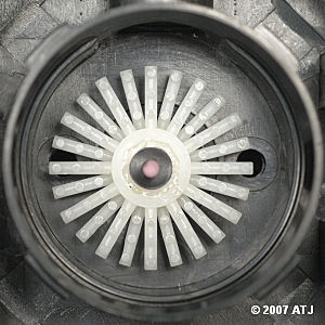 The first required modification is to the supplied nozzle cone. The air feeds through a hole on the flange that connects to the pump. As the pump will be external, the supplied gaskets are required to seal the connections to the pump, however, the gasket blocks the hole on the nozzle cone flange. It is necessary to cut the hole right down to the inside of the nozzle cone so the air will clear the gasket. I was able to do this with a hobby knife by just making small nicks in the edge until the hole exposed to the inside of the nozzle cone was around the same size as the hole in the flange (Figure 7).
