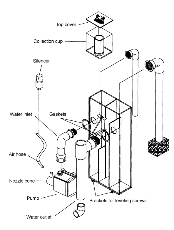 The skimmer itself is nothing special, but for $150 delivered I wasn't expecting the best darn skimmer out there. It has a fairly simple design as shown in the assembly diagram in Figure 1.