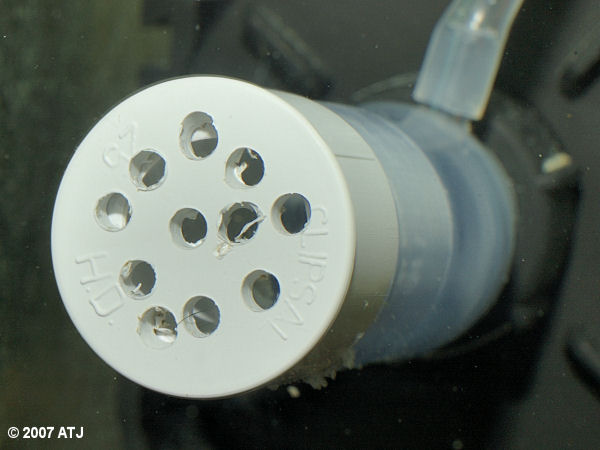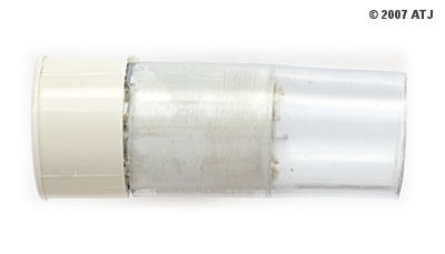 The nozzle cone on the intake of the pump has the same outside diameter as 20mm electrical conduit. The inside diameter of 16mm clear vinyl tube also fits snugly over nozzle. I used a short length of 16mm clear vinyl tube to connect the nozzle cone to a short length of 20mm electrical conduit with an end cap fitted. I drilled 1/8" holes in the end cap until the flow rate was high enough to get good bubbles but not too high as to overflow the skimmer. The cap was held in place by wrapping some plumbing tape around the end of the conduit to make a snug fit. Figure 4 shows the completed strainer/flow restrictor and Figure 5 shows it in place on the pump.