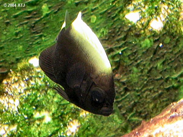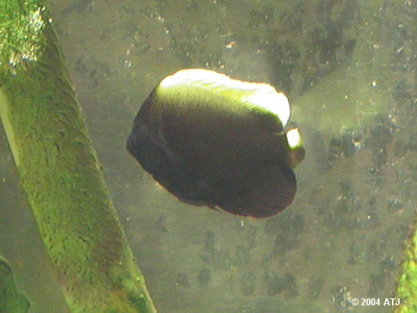 The tiny angelfish in the quarantine tank a day after capture. The size of this angelfish can be gauged against the airline to the left of the fish.