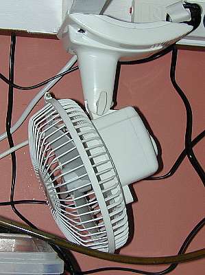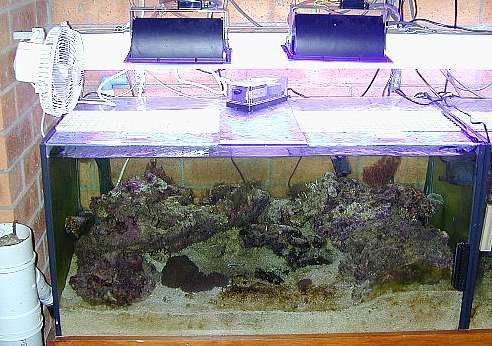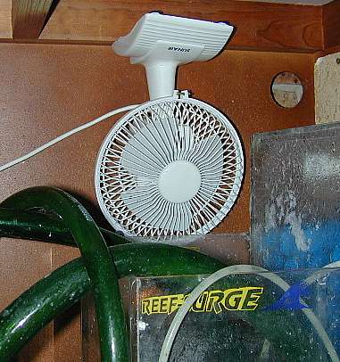 I also have another fan blowing air between the Metal Halide lamps and the top of 50G Reef 1. This fan is attached to the wall beside the tank.