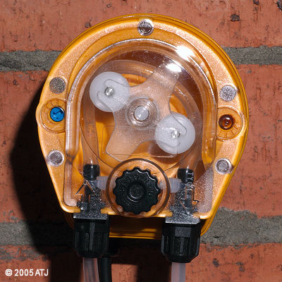 Two and a half litres of Kalkwasser are dripped into the overflow pipe throughout the day via an Aqua PER-R peristaltic pump (Figure 1). The pump has been adjusted so that its rate is around 250 mL/hr and the pump is on a timer with multiple on and off periods (Table 1) so that the total running time is 10 hours per day. The peristaltic pump pulls Kalkwasser from a 60 L reservoir (shared with 50G1) which is filled with the decanted liquid from my Bulk Kalkwasser.