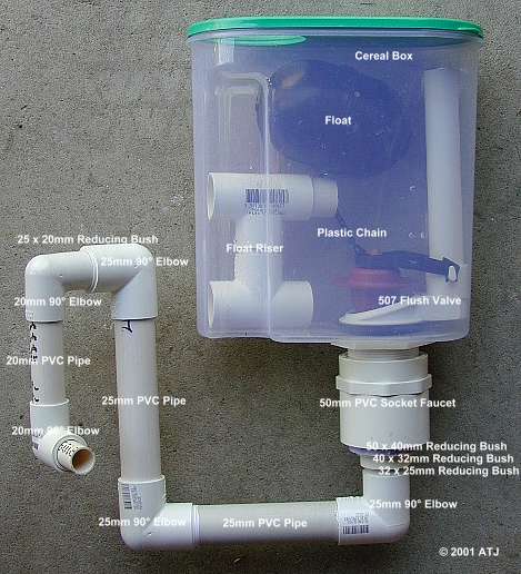 Drill a 60 mm hole in the bottom of the cereal container. Remove the flapper and then fit the flush valve through the hole and screw on retaining nut. Mark the top of the stand pipe on the flush valve about 1 cm below the top of the container. The stand pipe will need to be cut to ensure that if the flapper doesn't open, excess water will flow down the stand pipe. Remove the flush valve from the container and cut the stand pipe. Refit the flush valve into the container and screw on retaining nut.