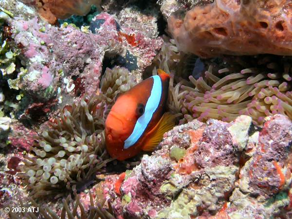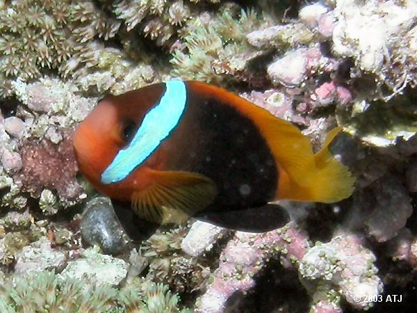 Black anemonefish, Amphiprion melanopus, at 7 m. |