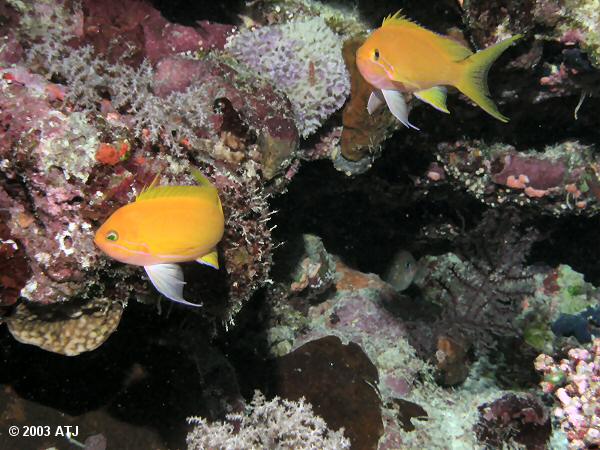Squarespot Anthias, Pseudanthias pleurotaenia, at 28.5 m. |