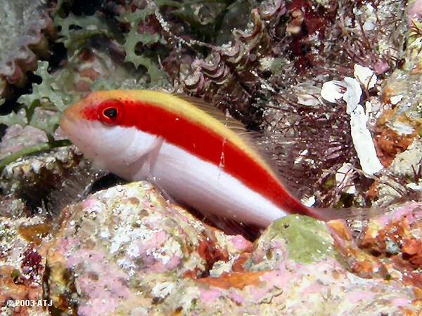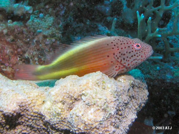 Blackside hawkfish, Paracirrhites forsteri at 14 m. |