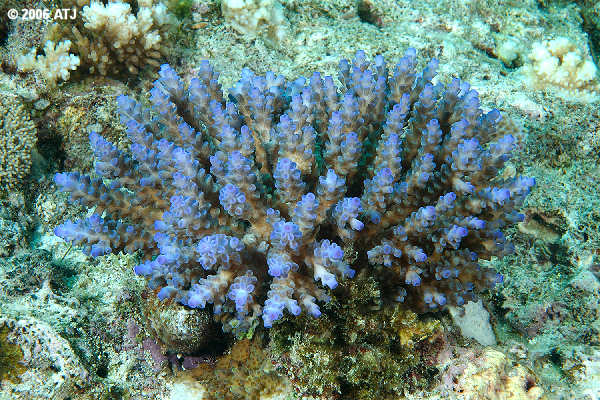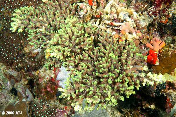 Sarcophyton sp. and Acropora aculeus colony. 15.1 m. |