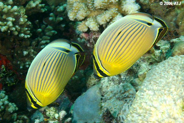 Two Pacific pinstriped butterflyfish, Chaetodon lunulatus. 6.5 m. |