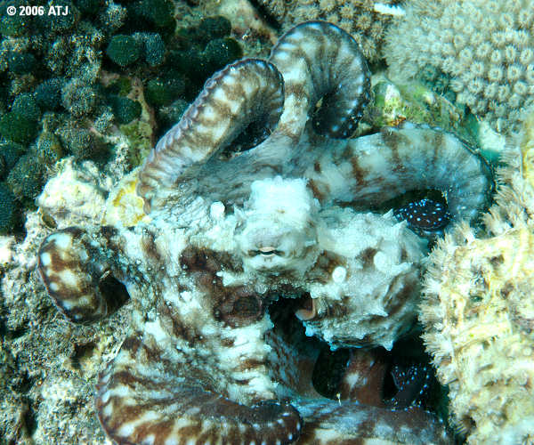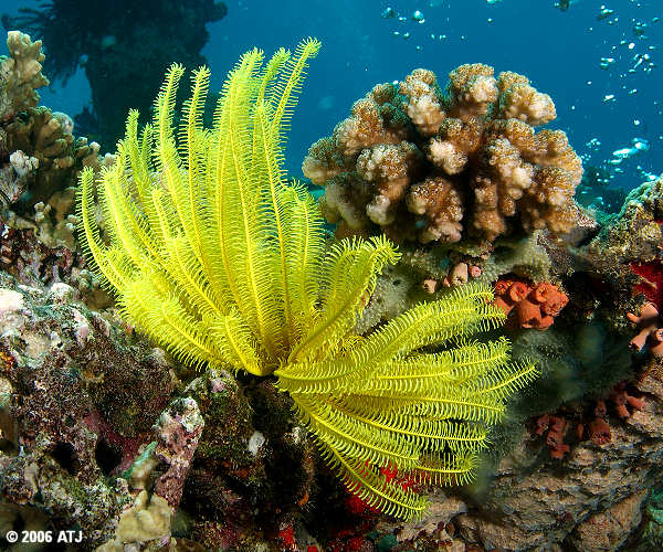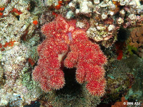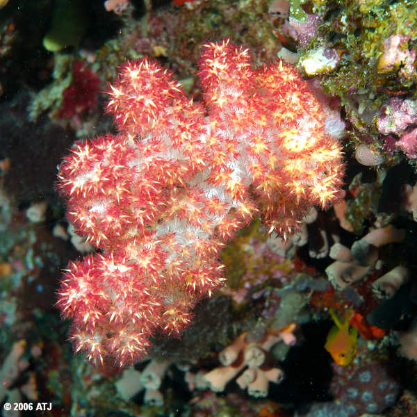 Thorny oyster, Spondylus sp., surrounded by a Briareum sp. colony. 15.3 m. |
