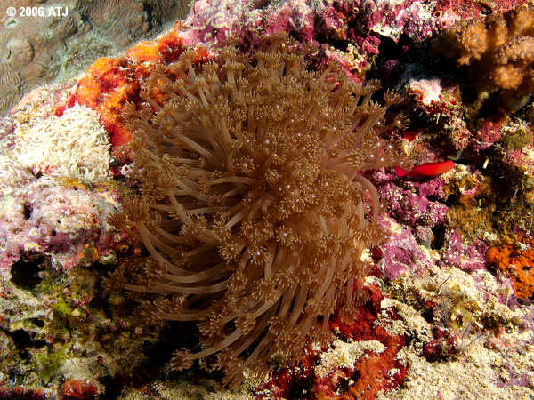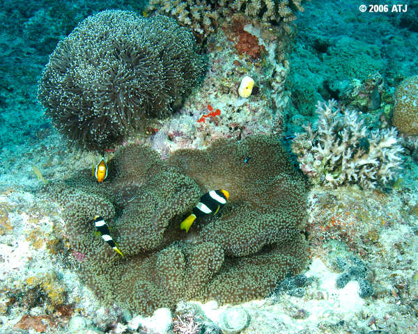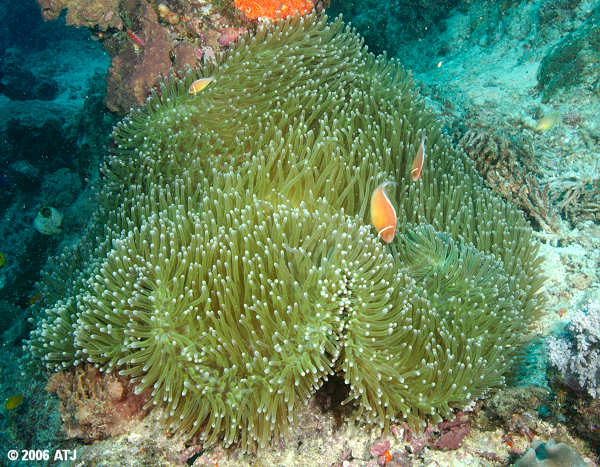 Sea anemone, probably Heteractis crispa, and black anemonefish, Amphiprion melanopus. 6 m. |