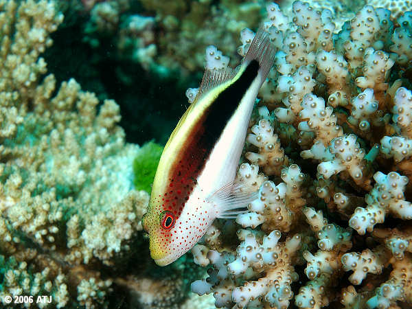 Blackside Hawkfish, Paracirrhites forsteri. 8.1 m. |