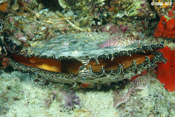 Thorny oyster, Spondylus sp., with spotted hawkfish, Cirrhitichthys oxycephalus. 6 m. |
