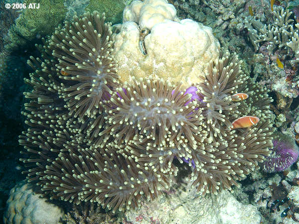 Sea anemone, Heteractis magnifica, with pink anemonefish, Amphiprion perideraion. 7.3 m. |