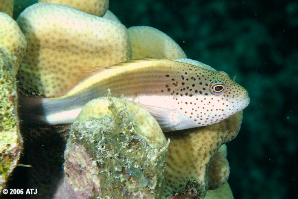Blackside hawkfish, Paracirrhites forsteri. 6.4 m. |