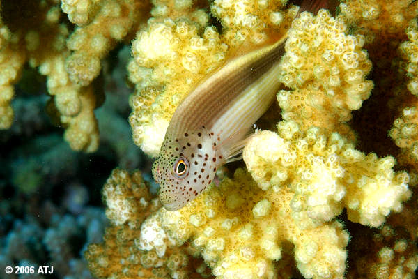 Blackside hawkfish, Paracirrhites forsteri. 6.2 m. |