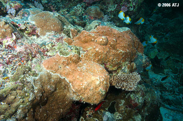 Large Montipora sp. colony with small Acropora sp. colony. 25.7 m. |