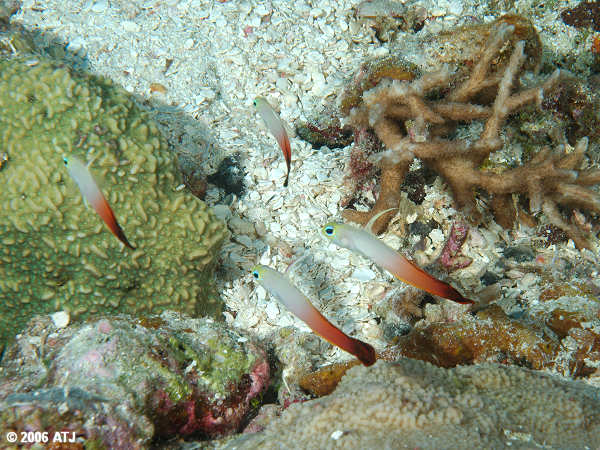 Four red firefish, Nemateleotris magnifica. 26.7 m. |