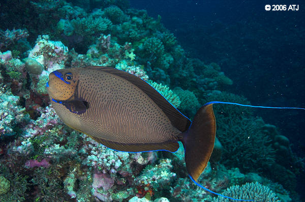Bignose unicornfish, Naso vlamingii. 7.1 m. |