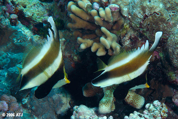 Two pennant bannerfish, Heniochus chrysostomus. 6.3 m. |