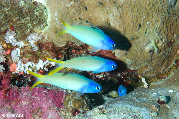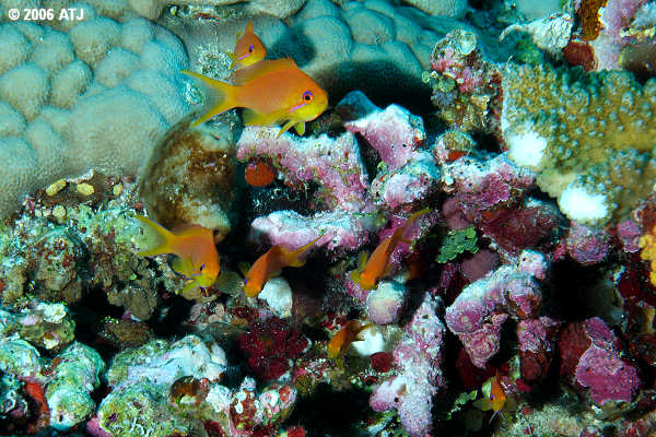 Multiple juvenile fairy basslets, Pseudanthias squamipinnis. 17.4 m. |