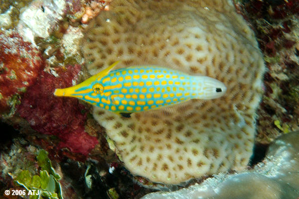 Orange-spotted filefish, Oxymonacanthus longirostris. 13 m. |