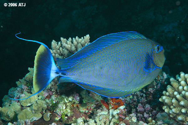 Big-nose unicornfish, Naso vlamingii. 12 m. |