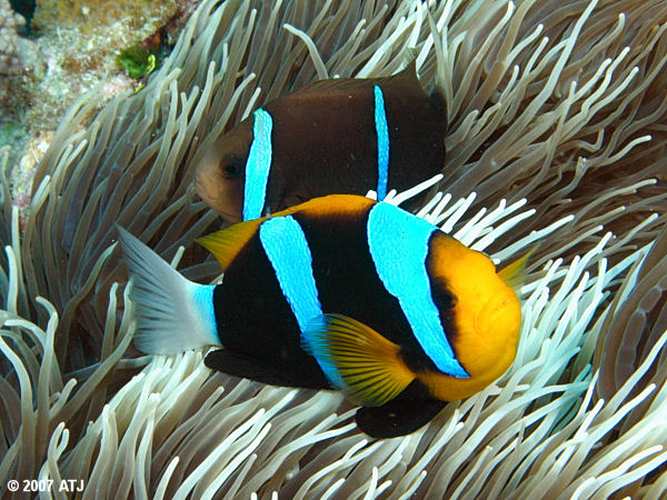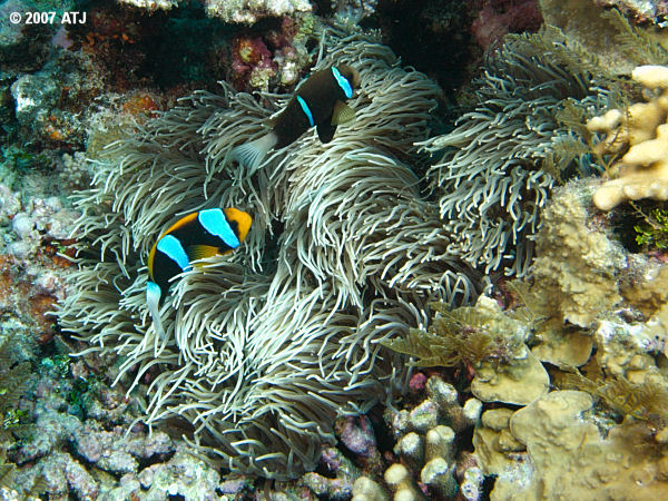 A mixed pair of anemonefish: orange-fin, A., and barrier reef, A. akindynos. 7 m. |