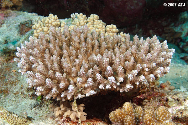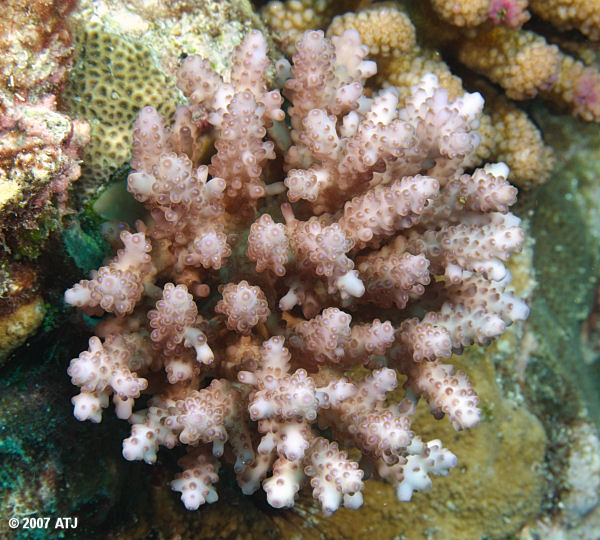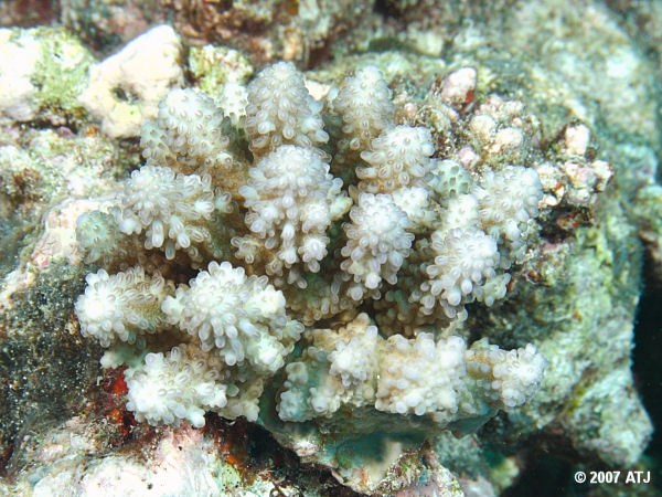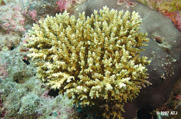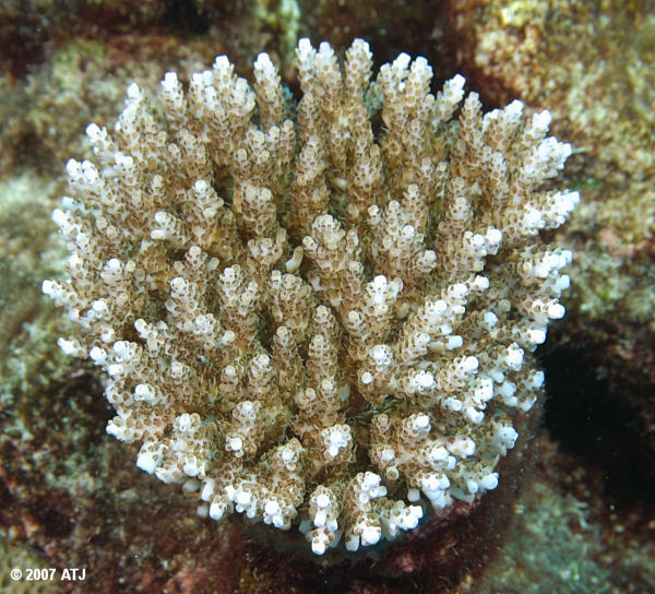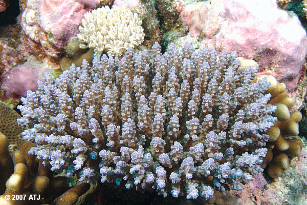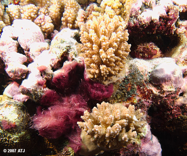 Two small Acropora sp. colonies surrounded by algae. 4.2 m. |