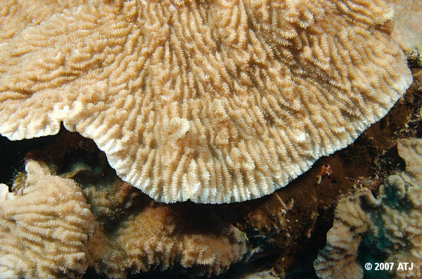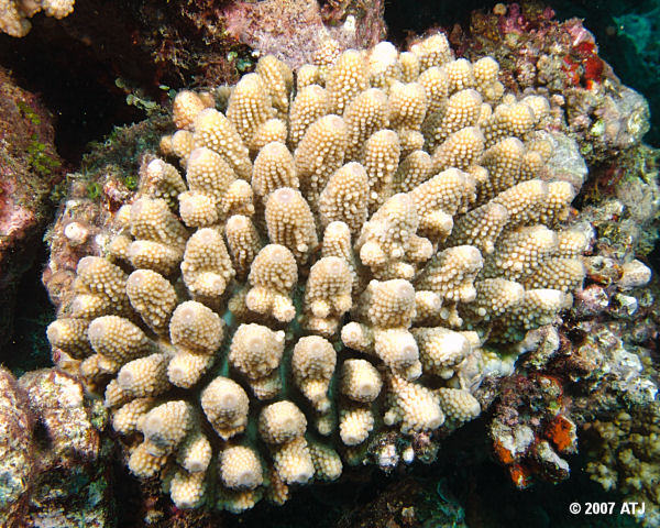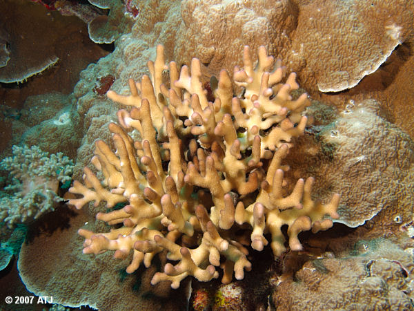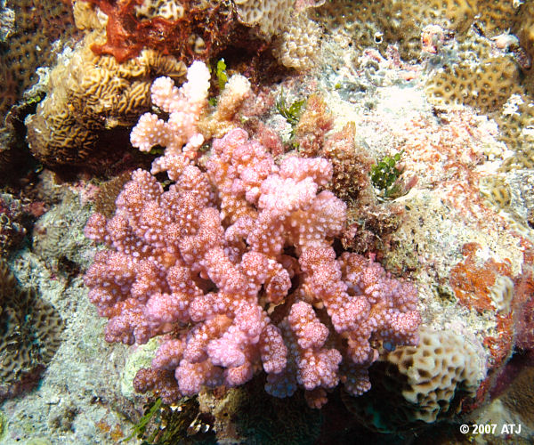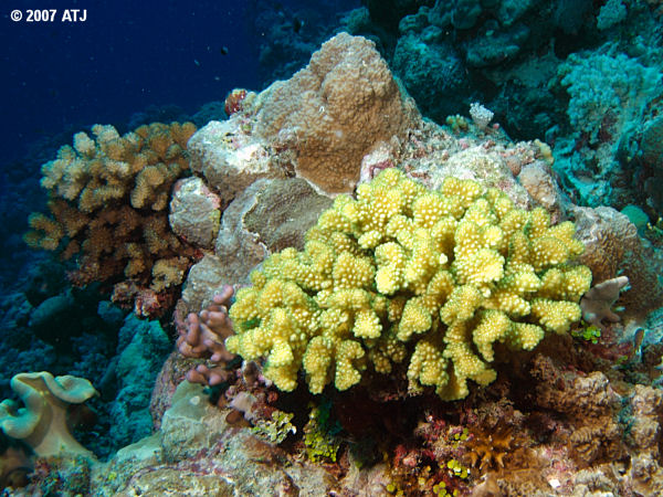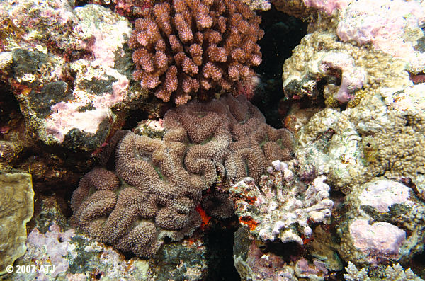 Lobophyllia sp. (below) and Pocillopora verrucosa colonies. 4.8 m. |