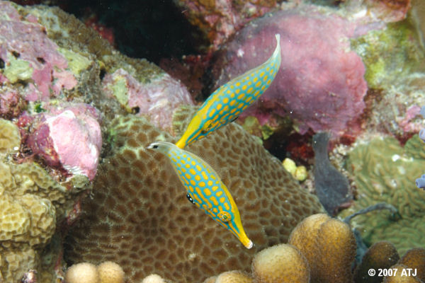 A pair of orange-spotted filefish, O. longirostris. 7.5 m. |