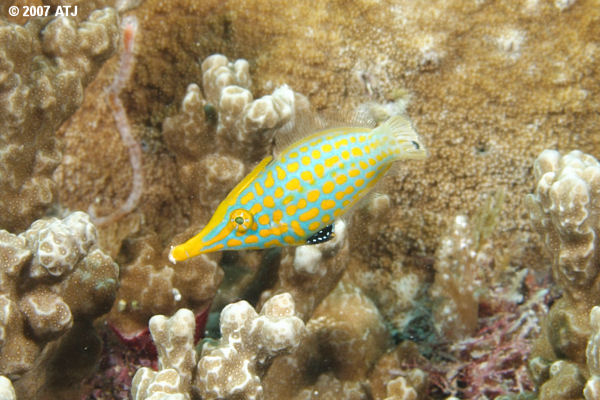 Orange-spotted filefish, Oxymonacanthus longirostris. 7 m. |