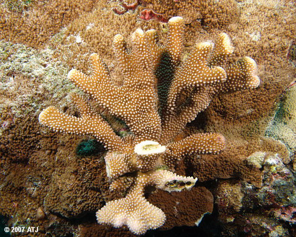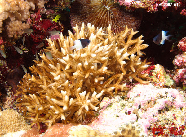 Seriatopora hystrix colony with chromis, Chromis iomelas. 17.5 m. |