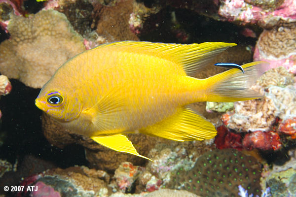 Damselfish, Parma sp., with juvenile cleaner wrasse, Labroides dimidiatus. 16.7 m. |