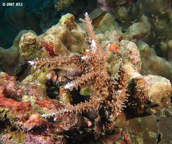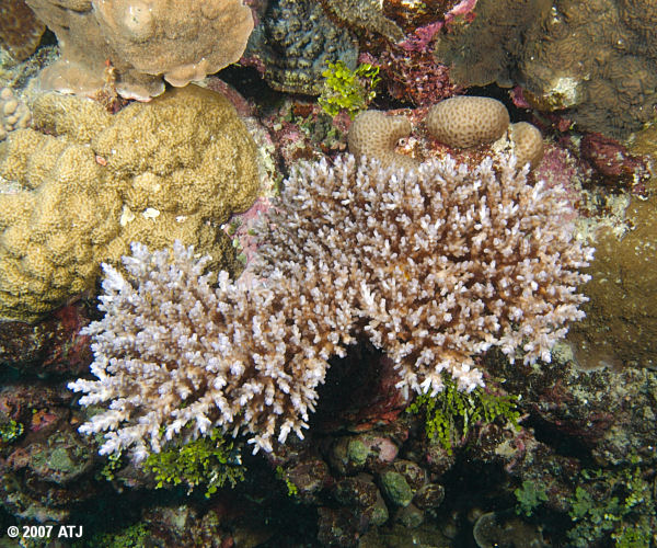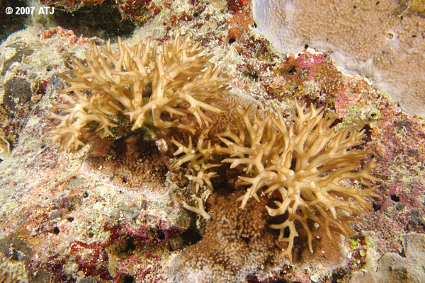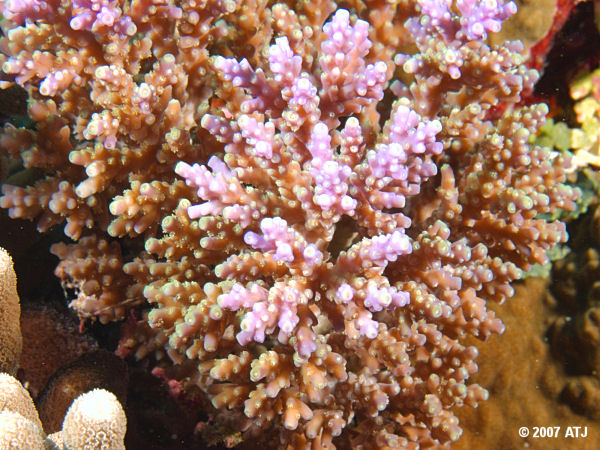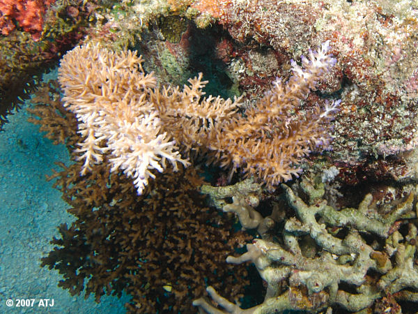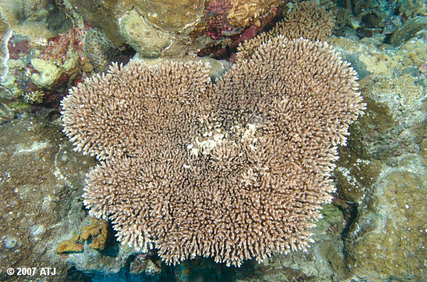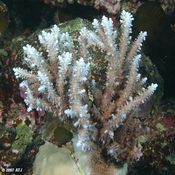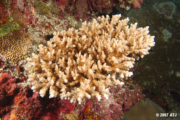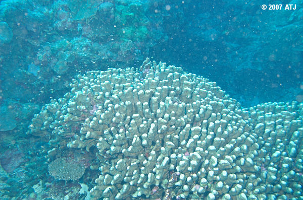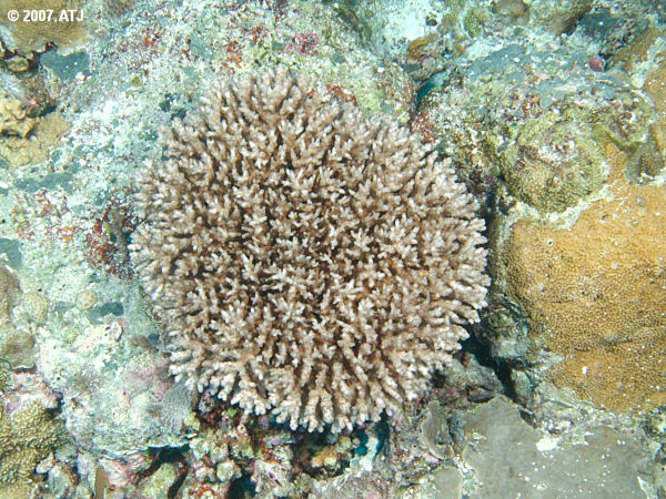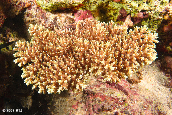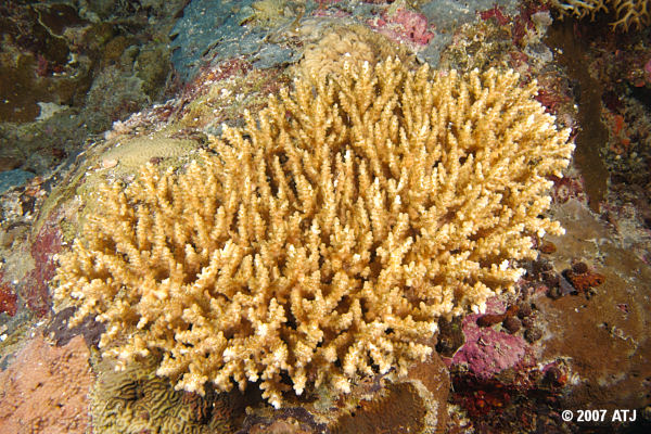 Acropora sp. colony, probably A. aculeus. 28.7 m. |