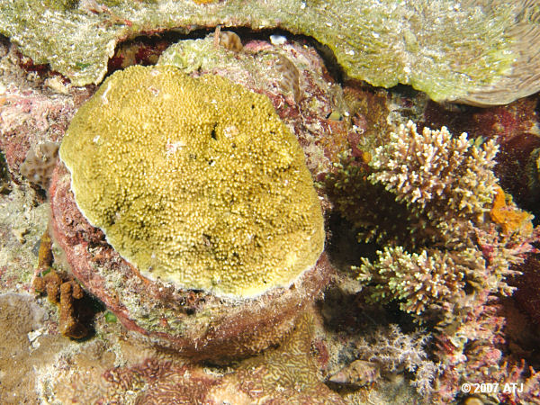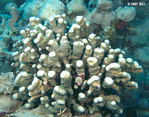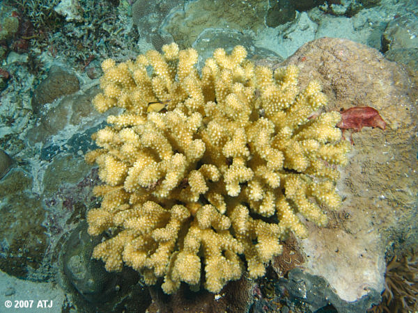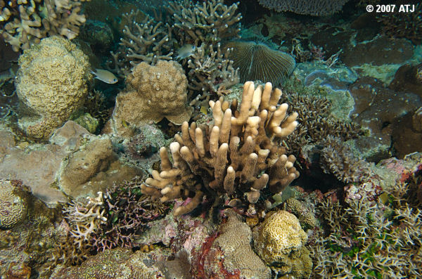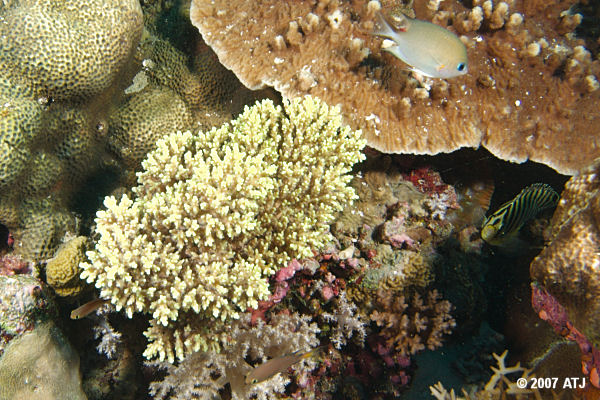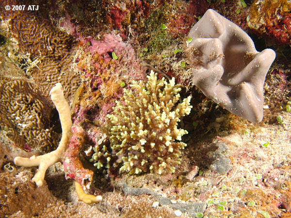 Hydrocoral, Millepora sp., stony coral, Acropora sp. (probably A. aculeus), and soft coral, Sarcophyton sp. 27.1 m. |