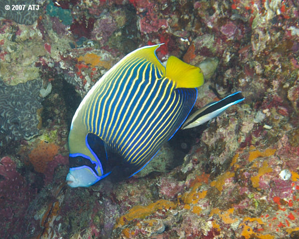 Emperor angelfish, P. imperator, being cleaned by a cleaner wrasse, Labroides dimidiatus. 17.6 m. |