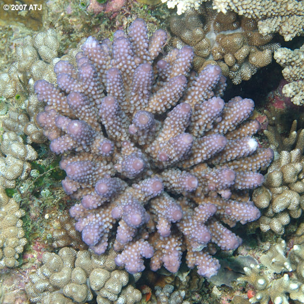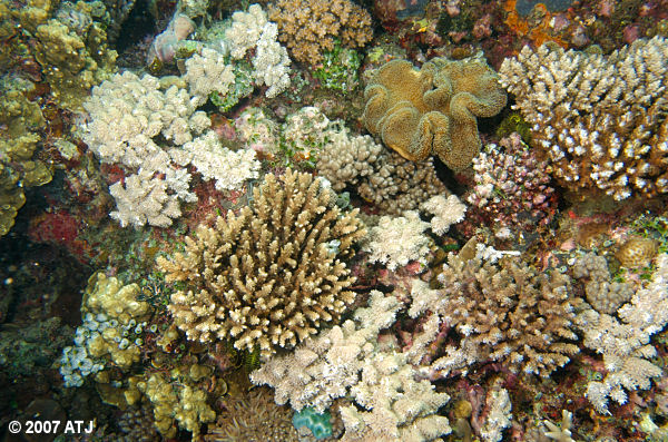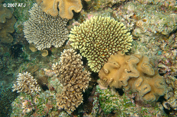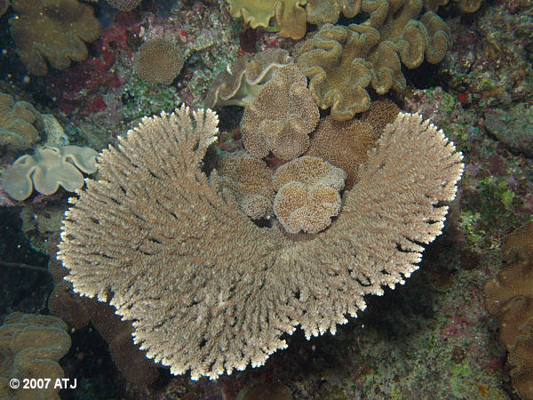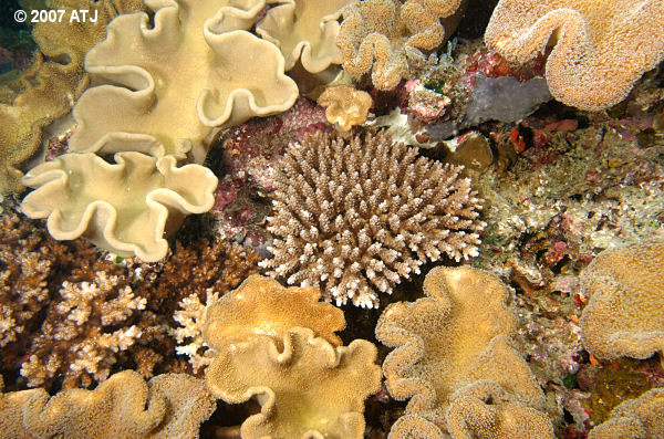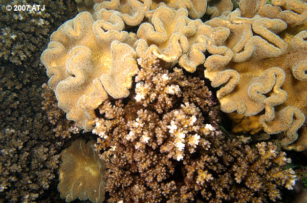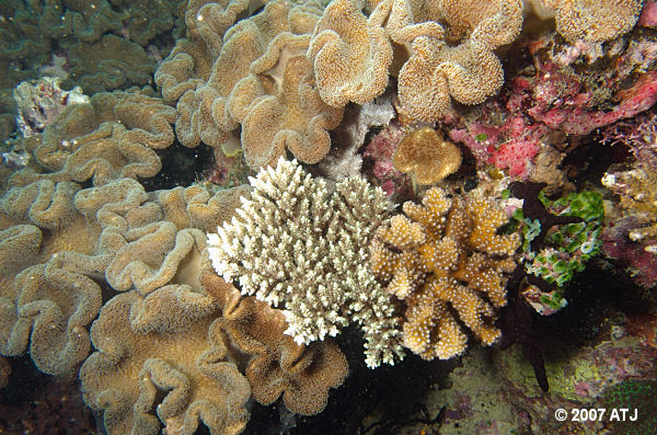 Soft corals, Sarcophyton sp., with Acropora sp. and Pocillopora sp. colonies. 6.8 m. |
