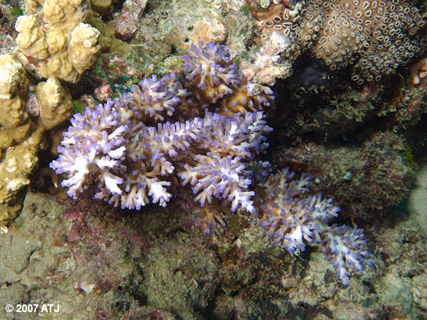 Acropora sp. colony surrounded by Sarcophyton sp. colonies. 6.1 m. |