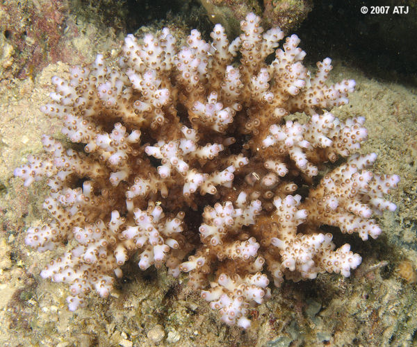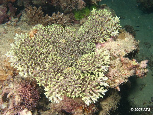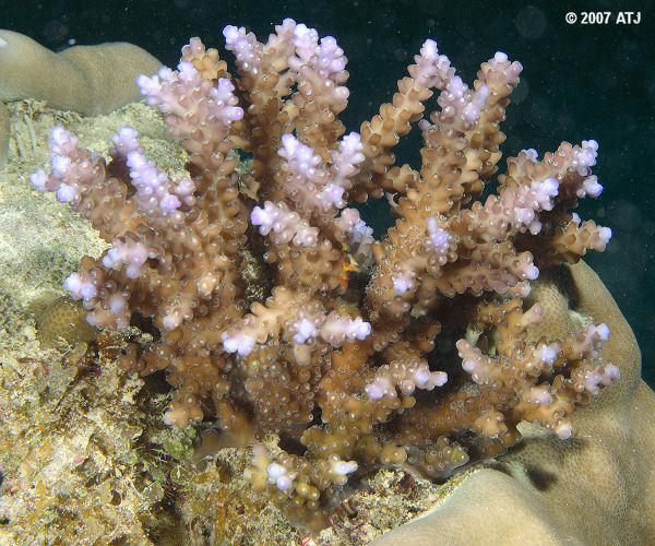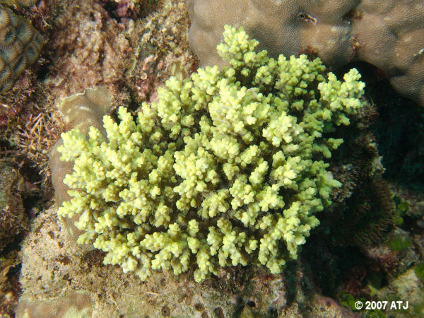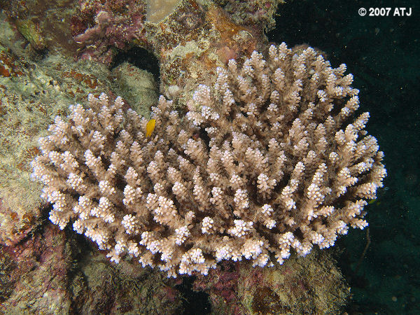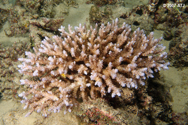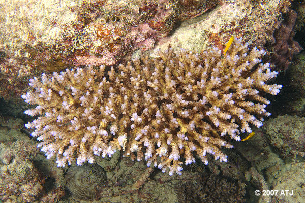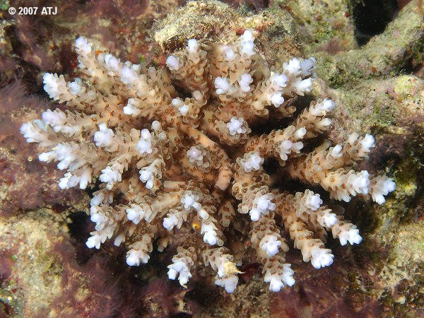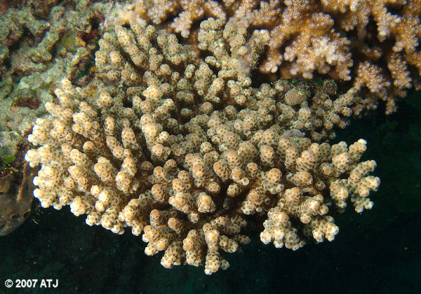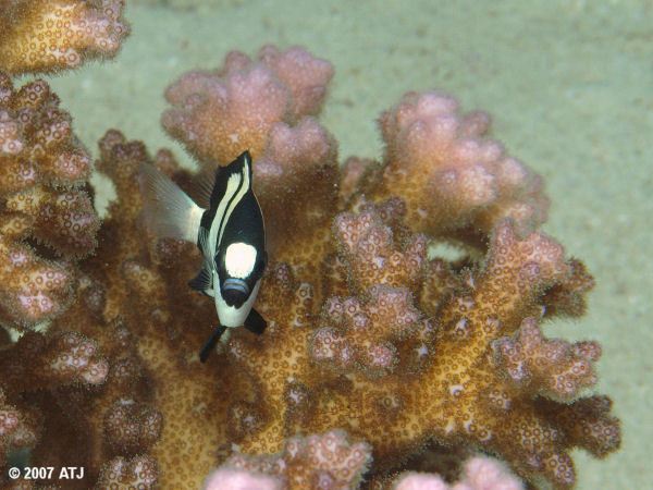 Humbug damselfish, Dascyllus aranus, in Pocillopora damicornis colony. 15.4 m. |