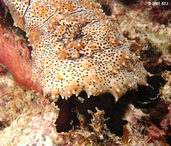 Anterior end of a sea cucumber, Bohadschia graeffi, showing feeding tentacles. 11.8 m. |