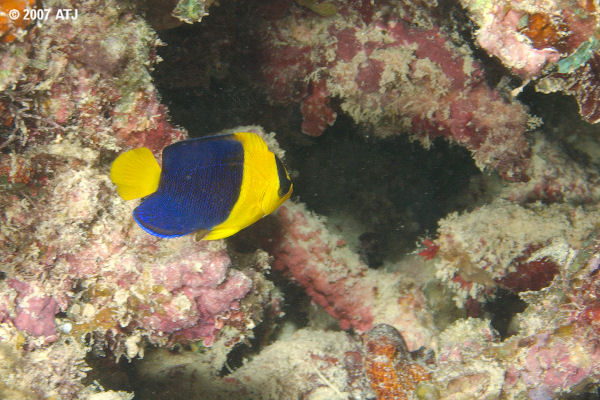 Juvenile bicolor angelfish, Centropyge bicolor. 9.9 m. |