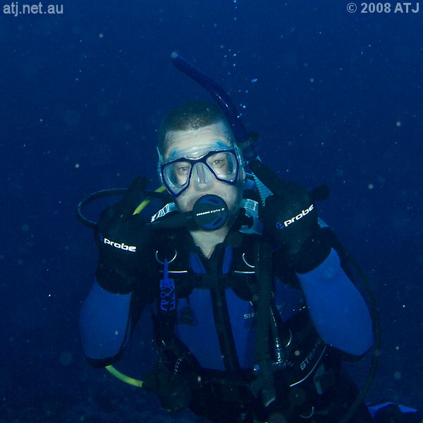 The boat dropped us off near the buoy and we descended the line below the buoy. We swam to the other end of the spur which is the cleaning station for manta rays. There were no manta rays, but I did get to see my first silvertip shark, Carcharhinus albimarginatus, and first scalloped hammerhead shark, Sphyrna lewini. |