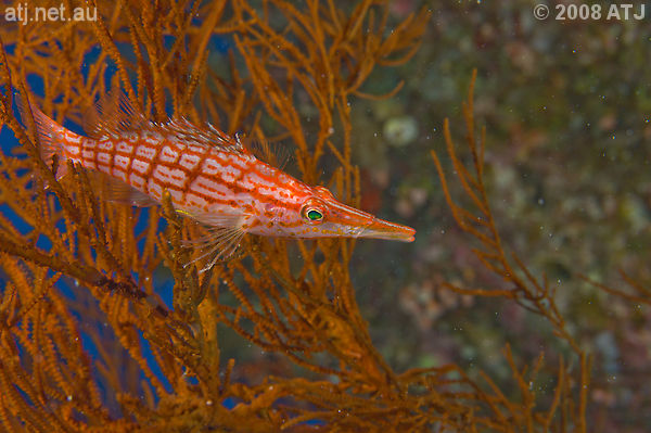 Longnose hawkfish, Oxycirrhites typus. 16.4 m. |