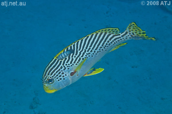 Diagonal-banded sweetlips, Plectorhinchus lineatus, with isopod parasites. 20.2 m. |