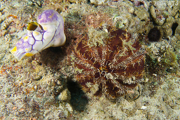 Tunicate, Polycarpa aurata (left) and collector sea urchin, Tripneustes gratilla. 12.2 m. |